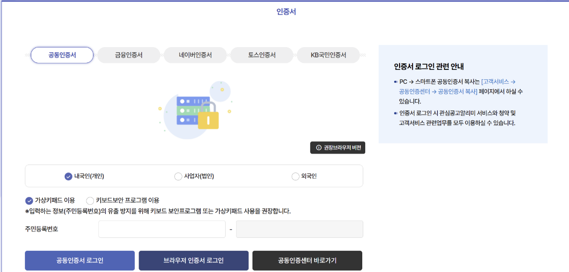 (공동인증서, 금융인증서, 네이버 인증서, 토스 인증서, KB국민 인증서 가능합니다)
